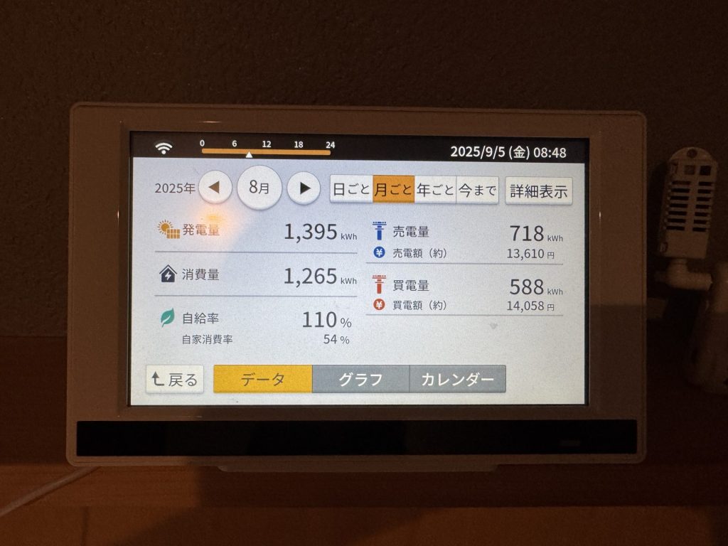 猛暑日が続いた8月。昼も夜も8月はエアコンに頼る時間が増えました。設定温度を気にすることもなく、快適にすごせました。高断熱の住まいだからこそ夏は“冷房の効き”を実感でき、家づくりの性能と太陽光発電の両方が、暮らしを支える大きな柱になっていると改めて感じました。