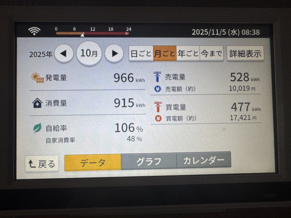 10月は、秋晴れの日が多く、冷房の使用頻度が減少し、設定温度も高めになっていった。今月も太陽光の電気をうまく自家消費できた月でした。秋は気温も安定していて、冷暖房の負担が少なく、まさに太陽の恵みをそのまま暮らしに活かせる季節だと感じます。