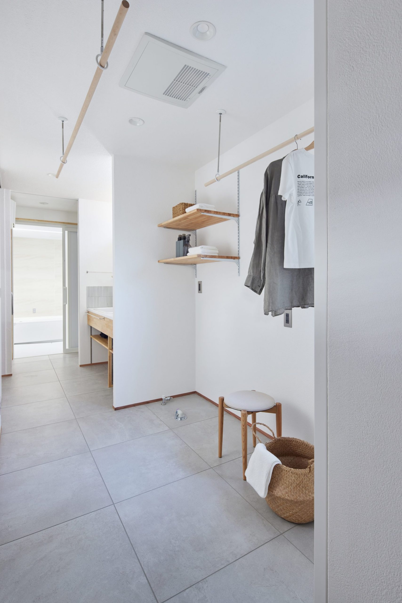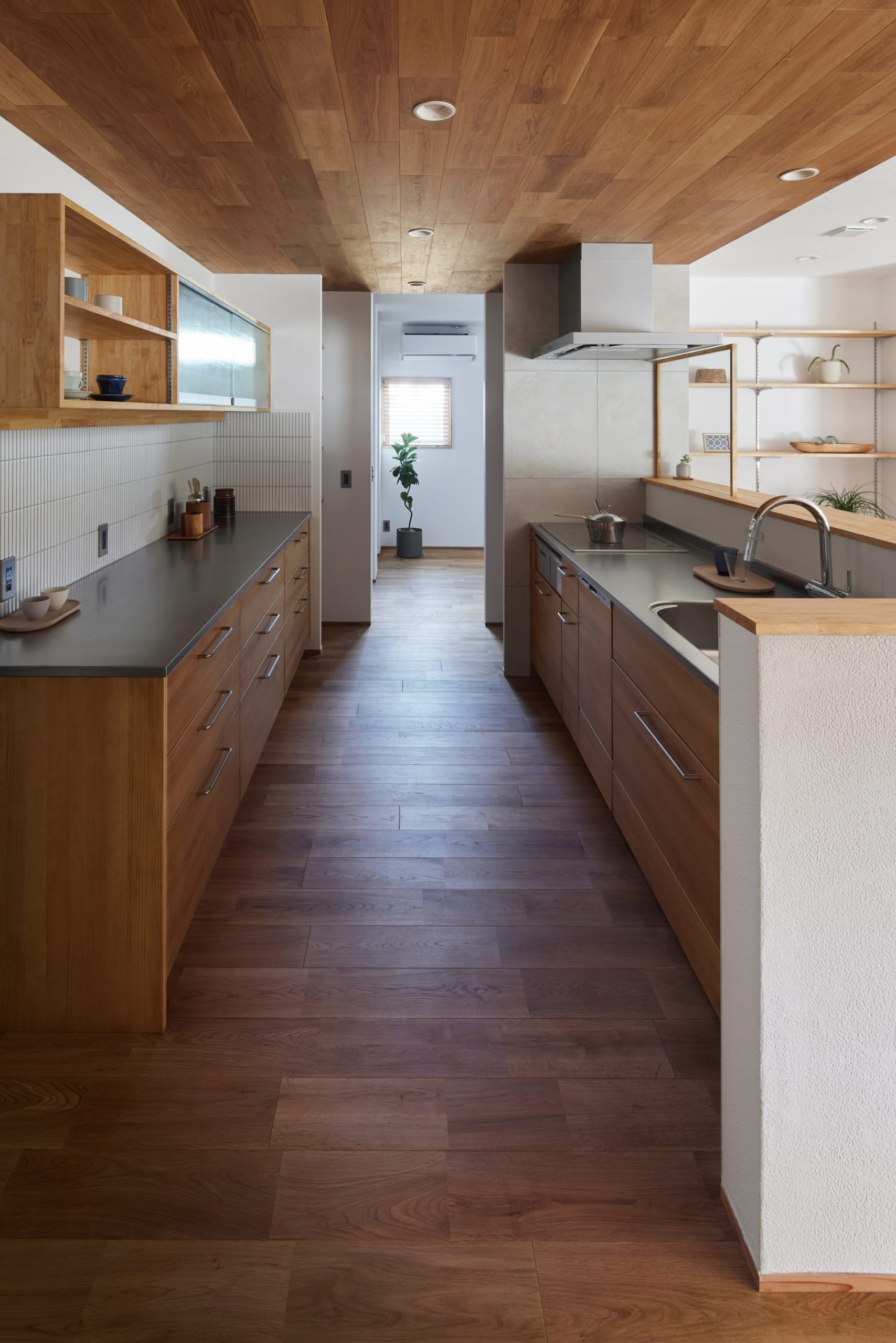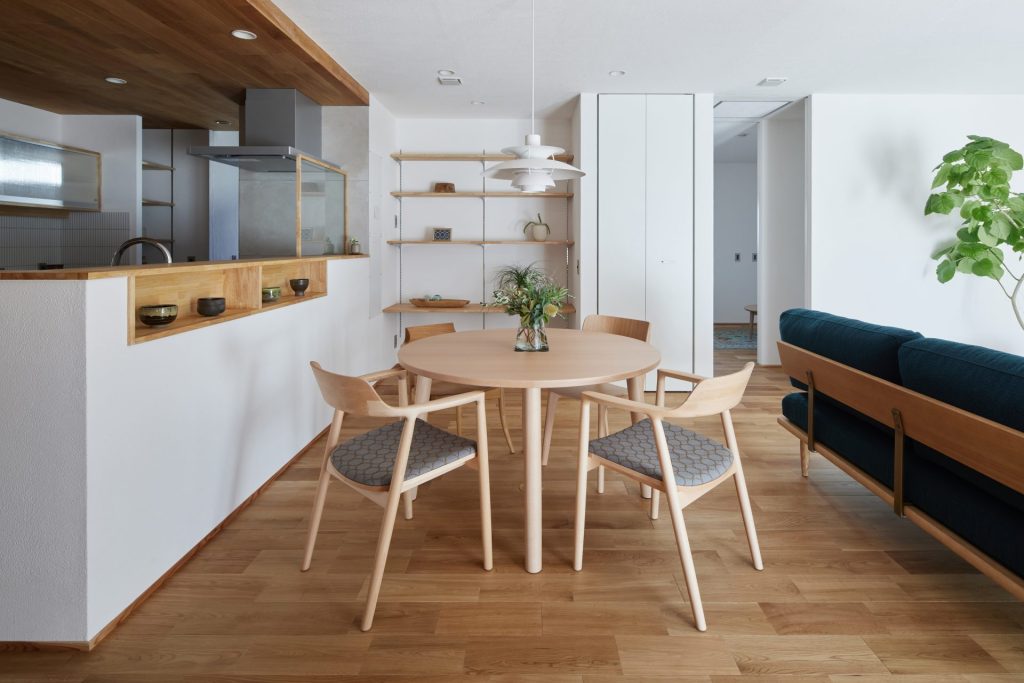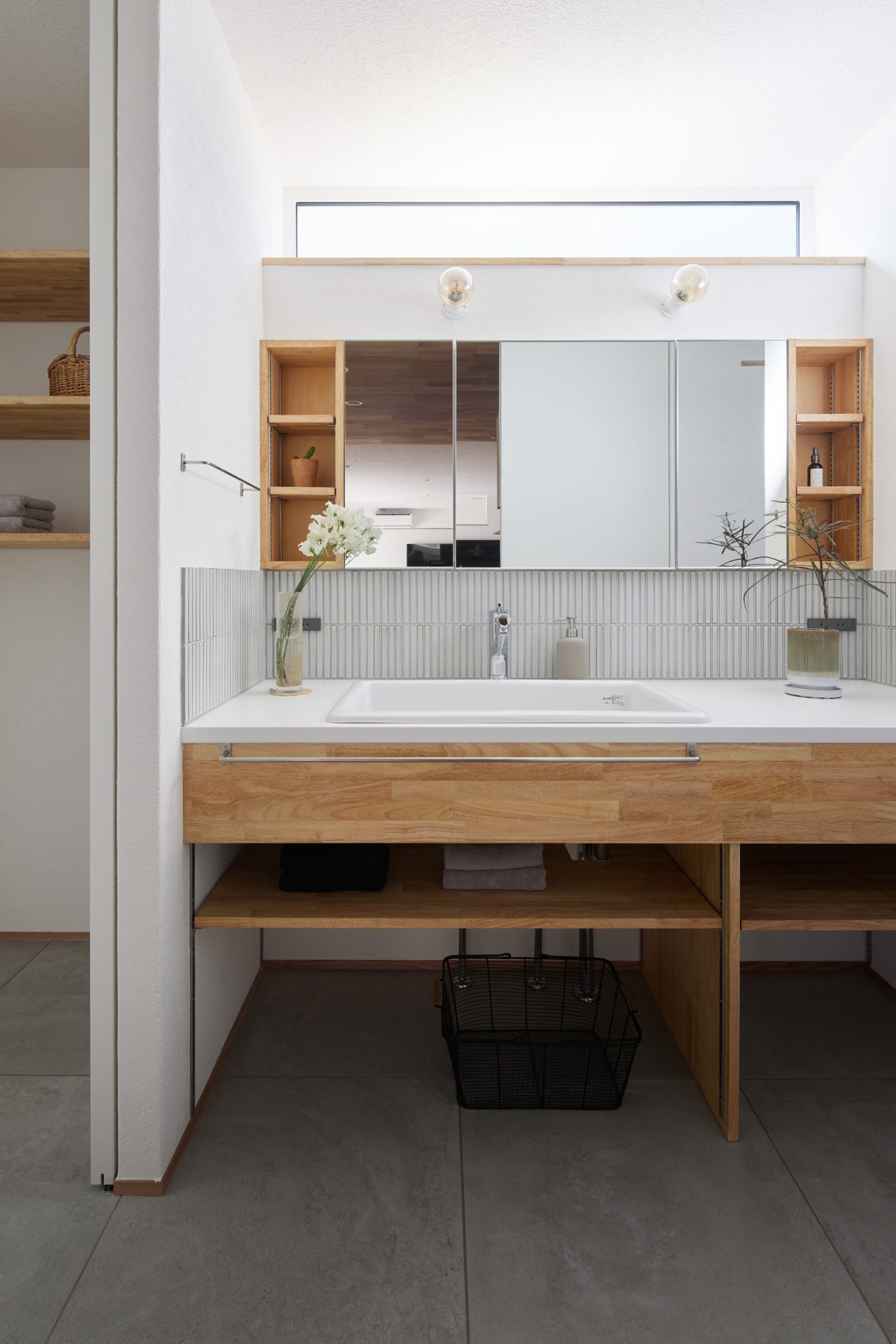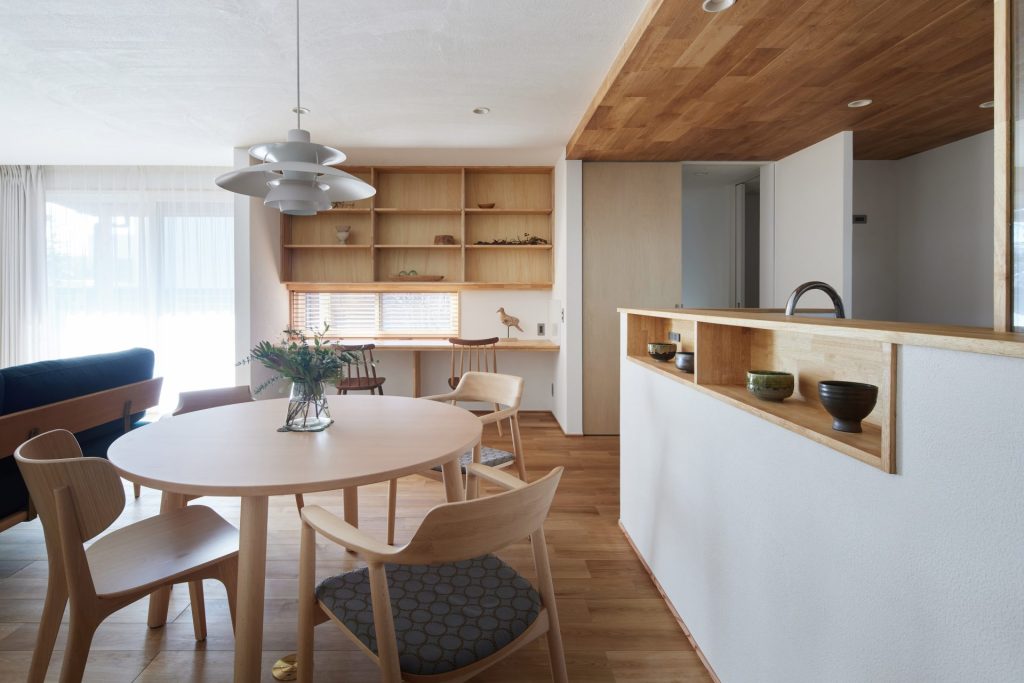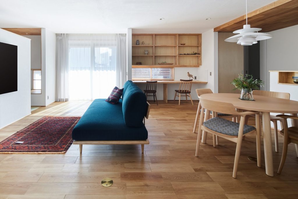 水まわりはキッチンとも近く、一直線にまとめ、回遊できる動線で家事をスムーズに。空間と動線に合わせた造作家具や、庭を望むデスクカウンターは外部に板塀を設けることで外の視線を気にすることなく、日常に心地よいリズムをもたらします。