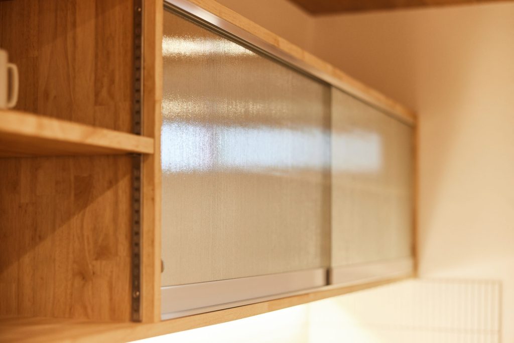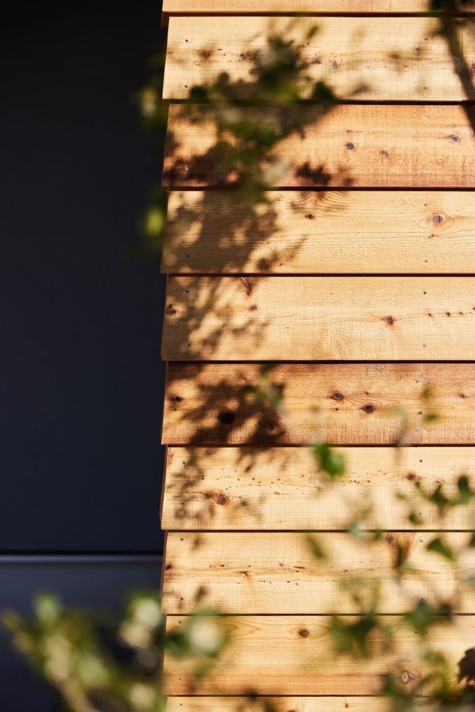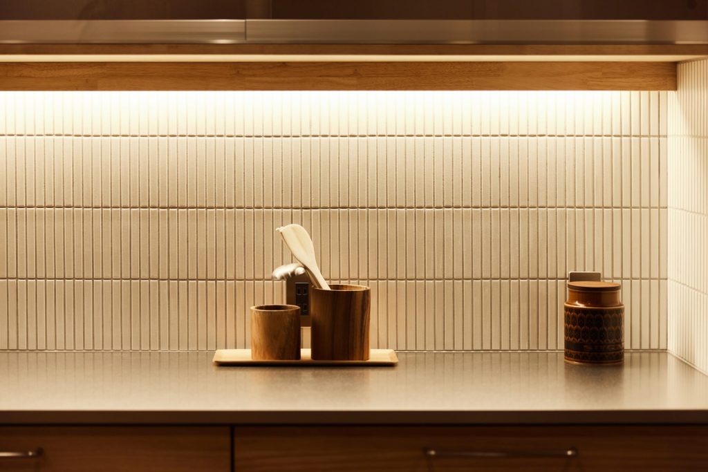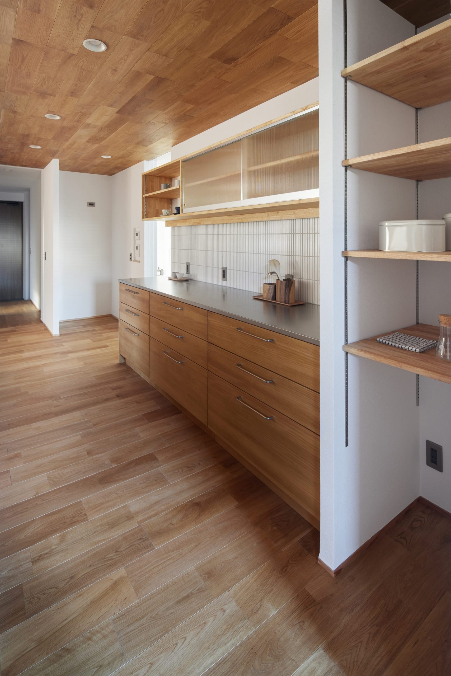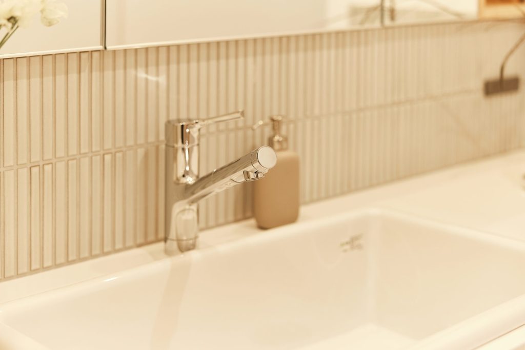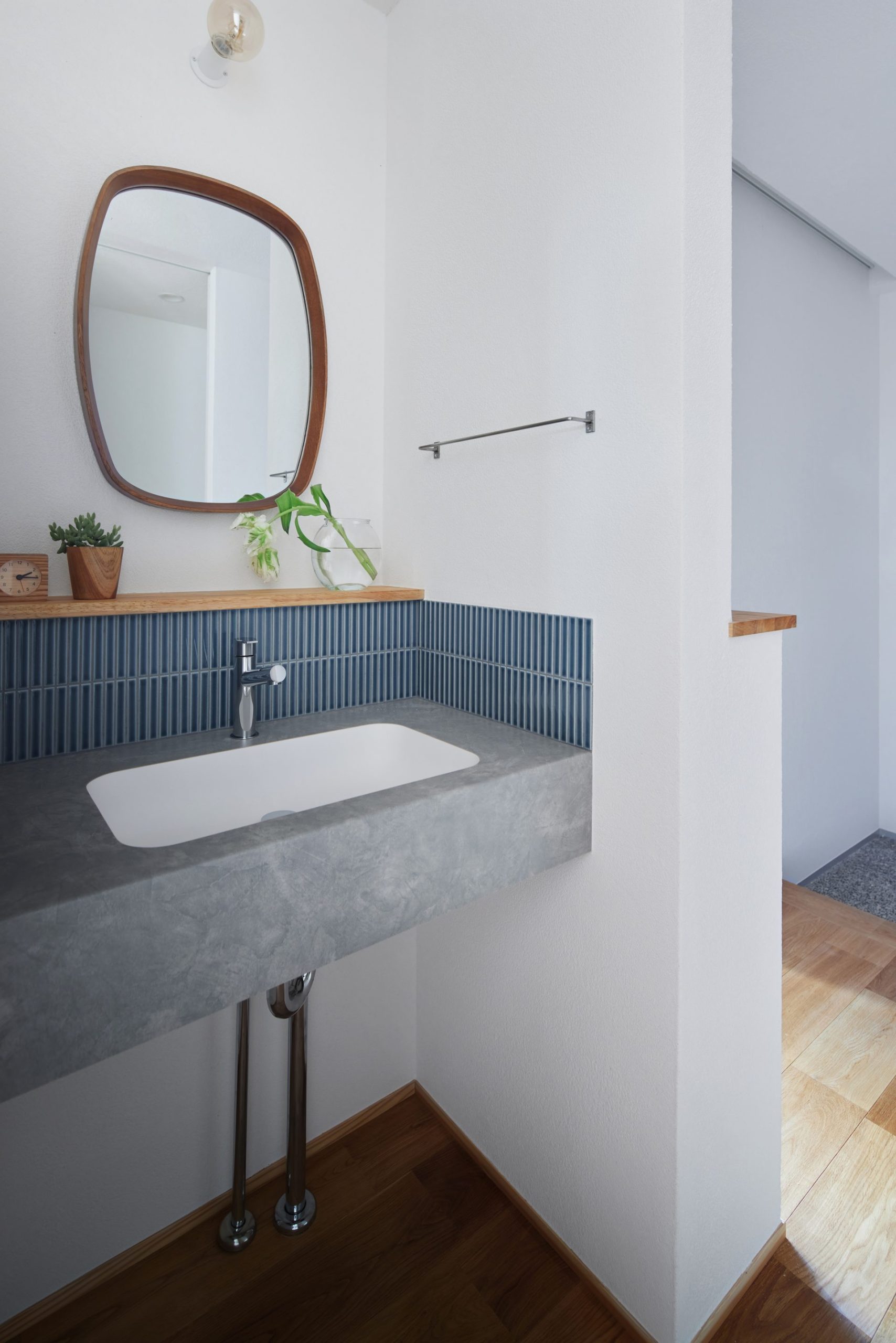 水まわりはキッチンとも近く、一直線にまとめ、回遊できる動線で家事をスムーズに。空間と動線に合わせた造作家具や、庭を望むデスクカウンターは外部に板塀を設けることで外の視線を気にすることなく、日常に心地よいリズムをもたらします。