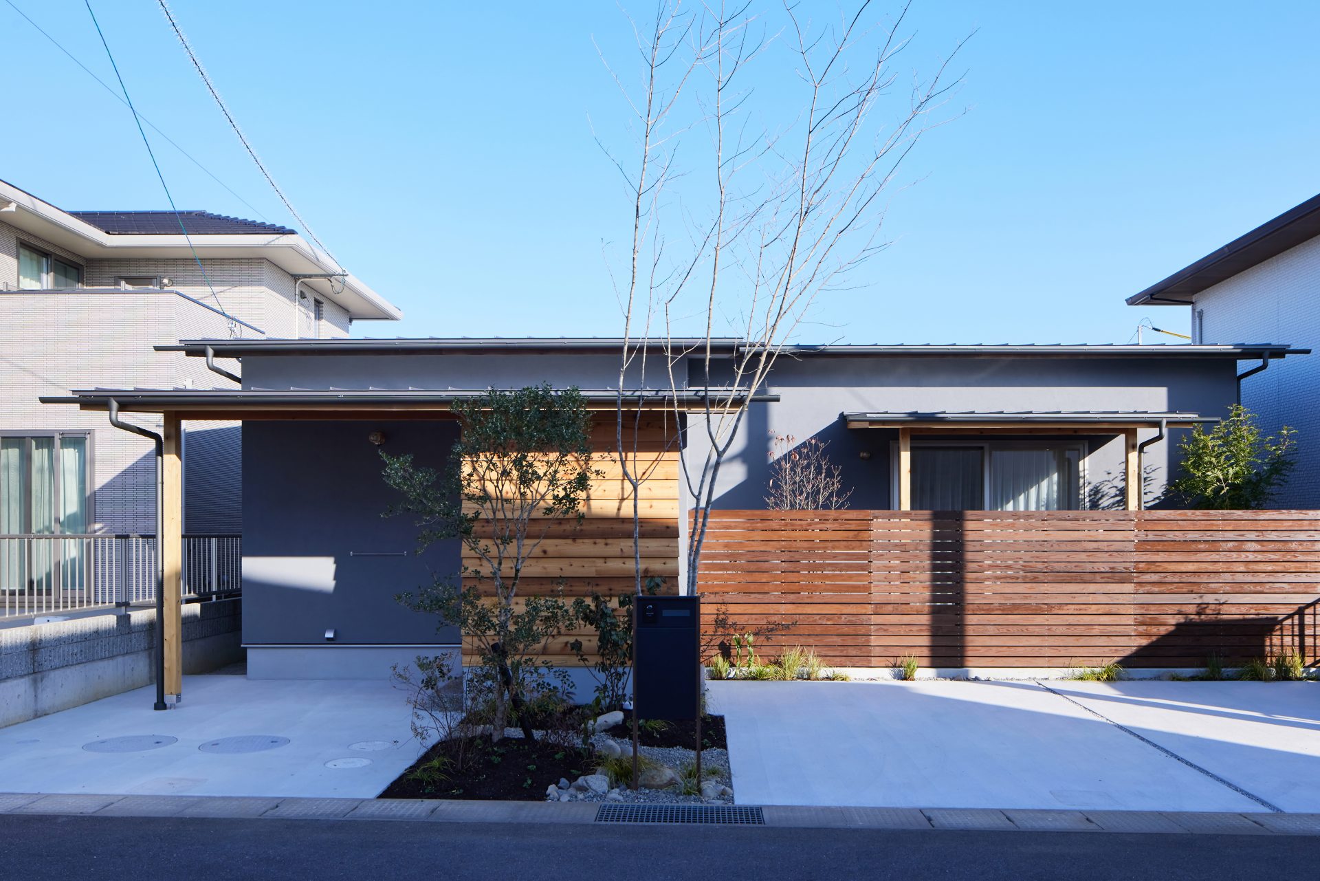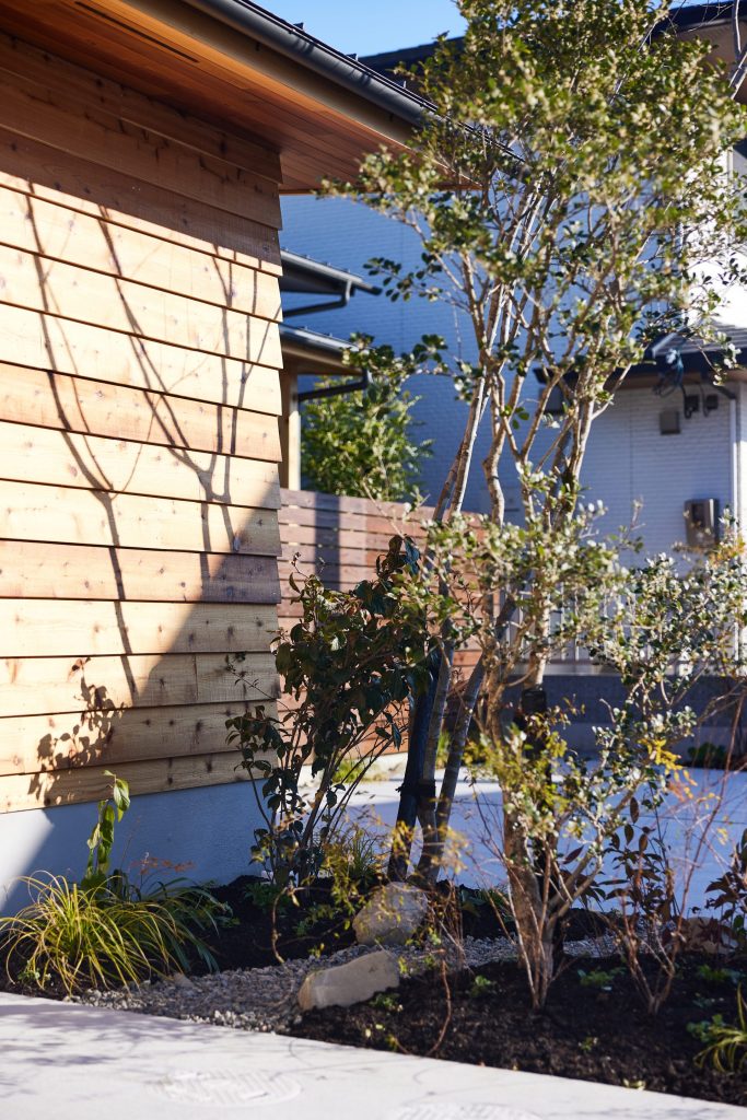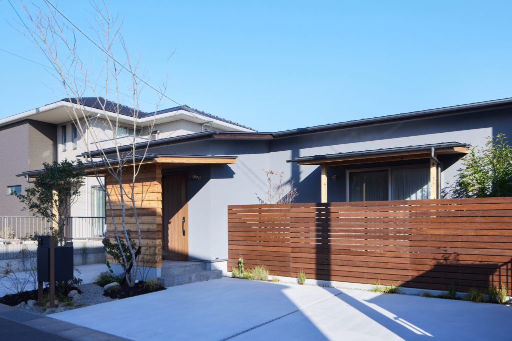 閑静な住宅エリアに建つ平屋。前庭と中庭を設けることで、周囲の視線をやわらかく遮りながら、住まいの内側に光と緑を招き入れる構成としました。