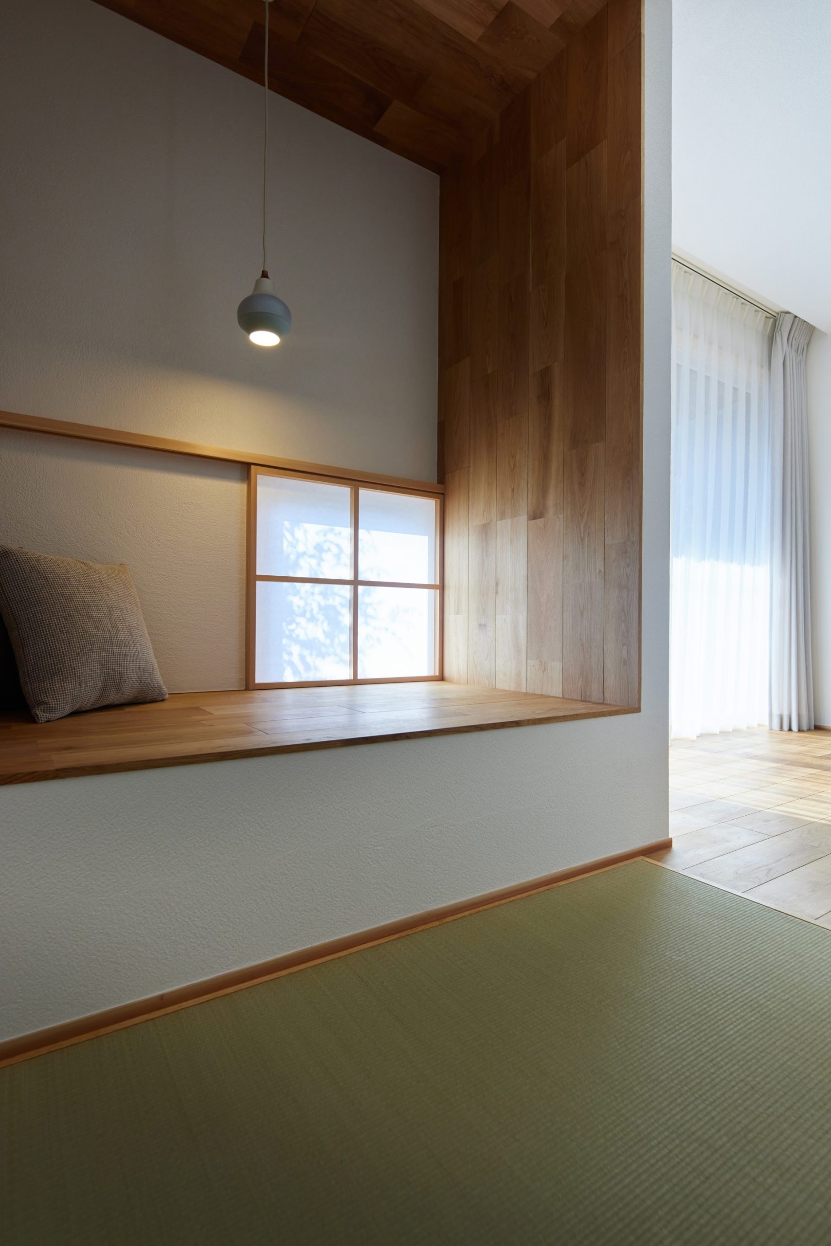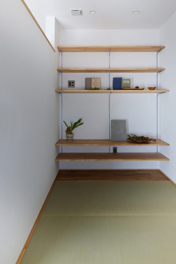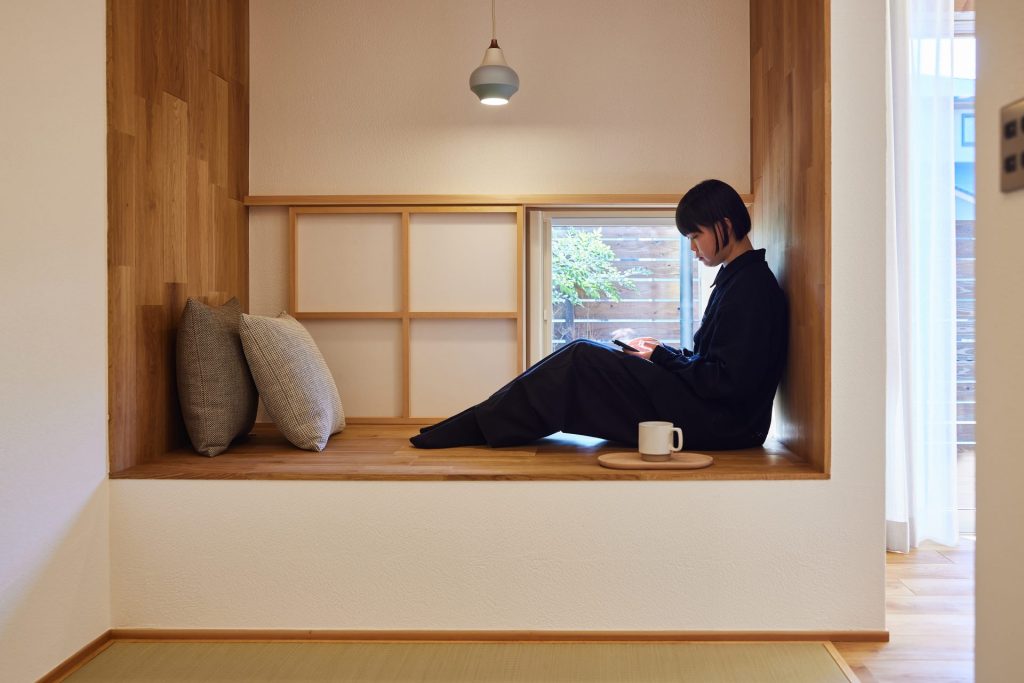 一段上がった奥まったヌックと障子窓が、静かに落ち着ける居場所をつくり、3畳の和室は、ヌック空間と目線の高さを変えることで、小さな空間でありながら、それぞれが趣味や作業に没頭できる“小さな自由の場”として計画。